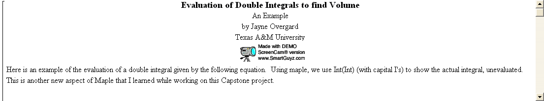 Scientific Notebook (then exported to html), then another Maple tutorial containing the main mathematical topic (Number 3, Approximating and Calculating the Volume of a Solid).
